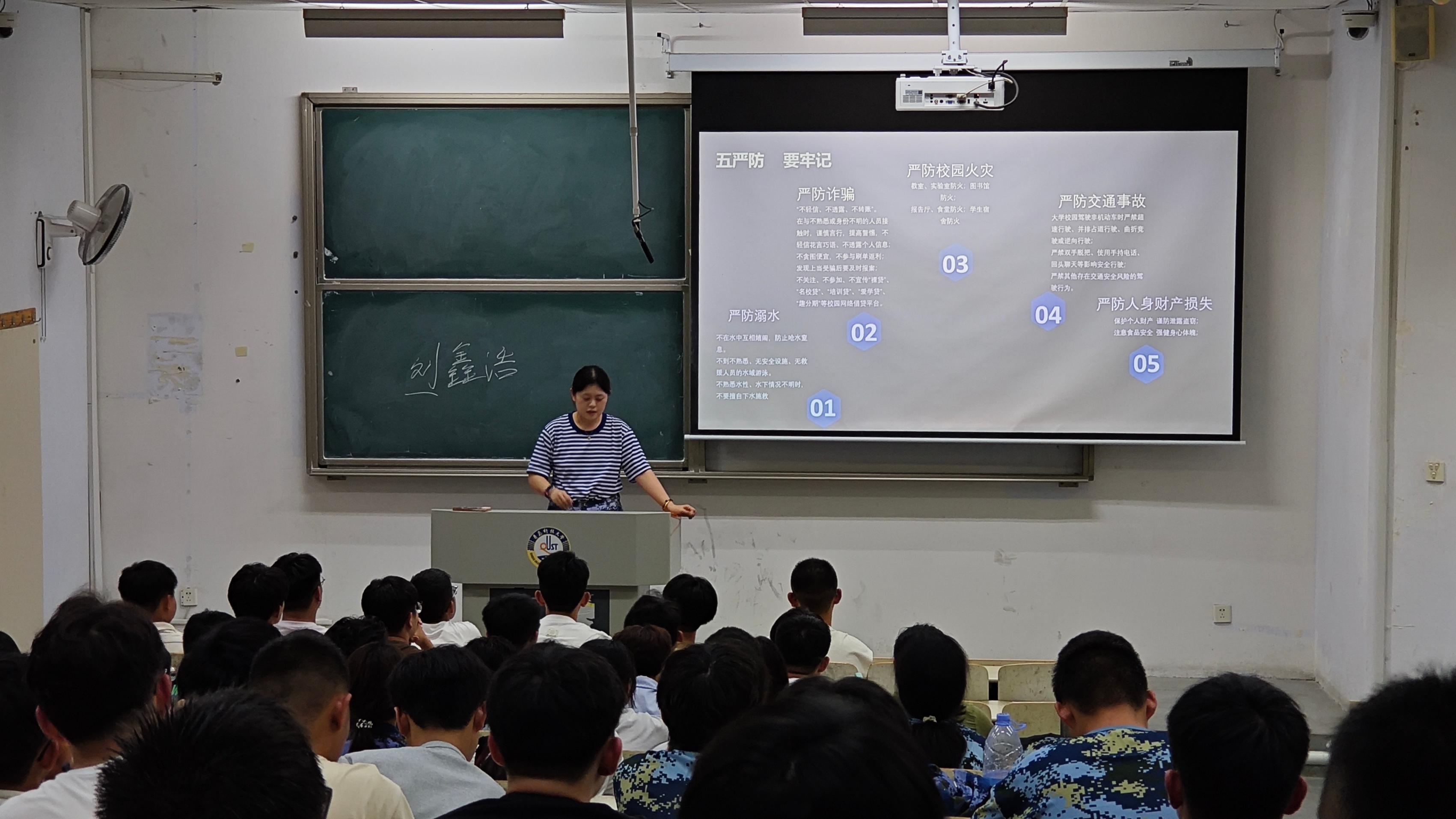 对于安全教育方面,卞文馨重点强调了“五严防”,即严防电信诈骗、严防溺水、严防交通事故、严防校园火灾、严防人身财产损失。通过展示具体实例和示意图,有效提升了新生的安全防范意识。