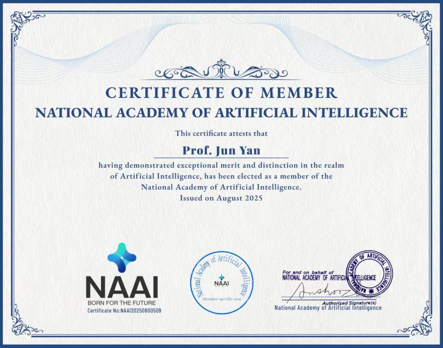 2025年8月,世俱杯买球入口世俱杯买球入口颜军院长成功当选美国国家人工智能科世俱杯买球入口(The National Academy of Artificial Intelligence,NAAI)院士。美国国家人工智能世俱杯买球入口贺信中高度赞扬了颜军院长在人工智能领域的“非凡成就和开创性贡献”,指出其“创新性研究、深刻见解和坚定不移的奉献精神激励了无数学者和从业者”。颜军院长的加入,将进一步丰富NAAI的学术讨论、科研合作及人工智能领域的全球推进工作。