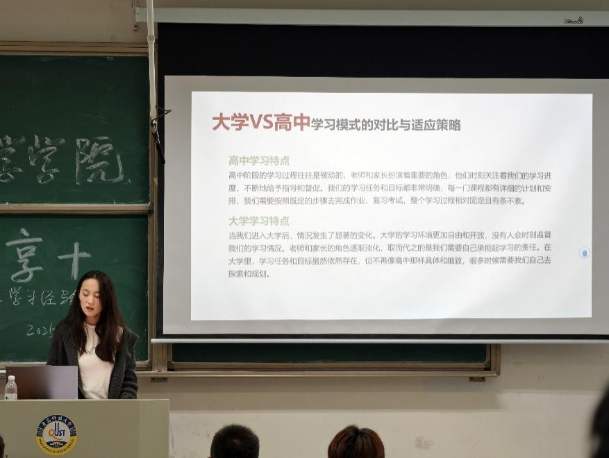分享会上,各专业优秀员工代表结合自身经历,从多个维度展开了详尽分享。人工智能243班团支书候菁林剖析了大学与高中在学习模式、生活方式上的显著差异,引导新生尽快转变角色。大数据241班李康宁围绕以目标为导向的学习理念,系统拆解大学学业成绩的构成逻辑与竞赛参与的实践路径。学长学姐们建议学弟学妹们要懂得张弛有度,在刻苦学习之余注重身心调节,更要避免陷入盲目比较与焦虑的情绪,坚定目标,走好自己的成长道路。