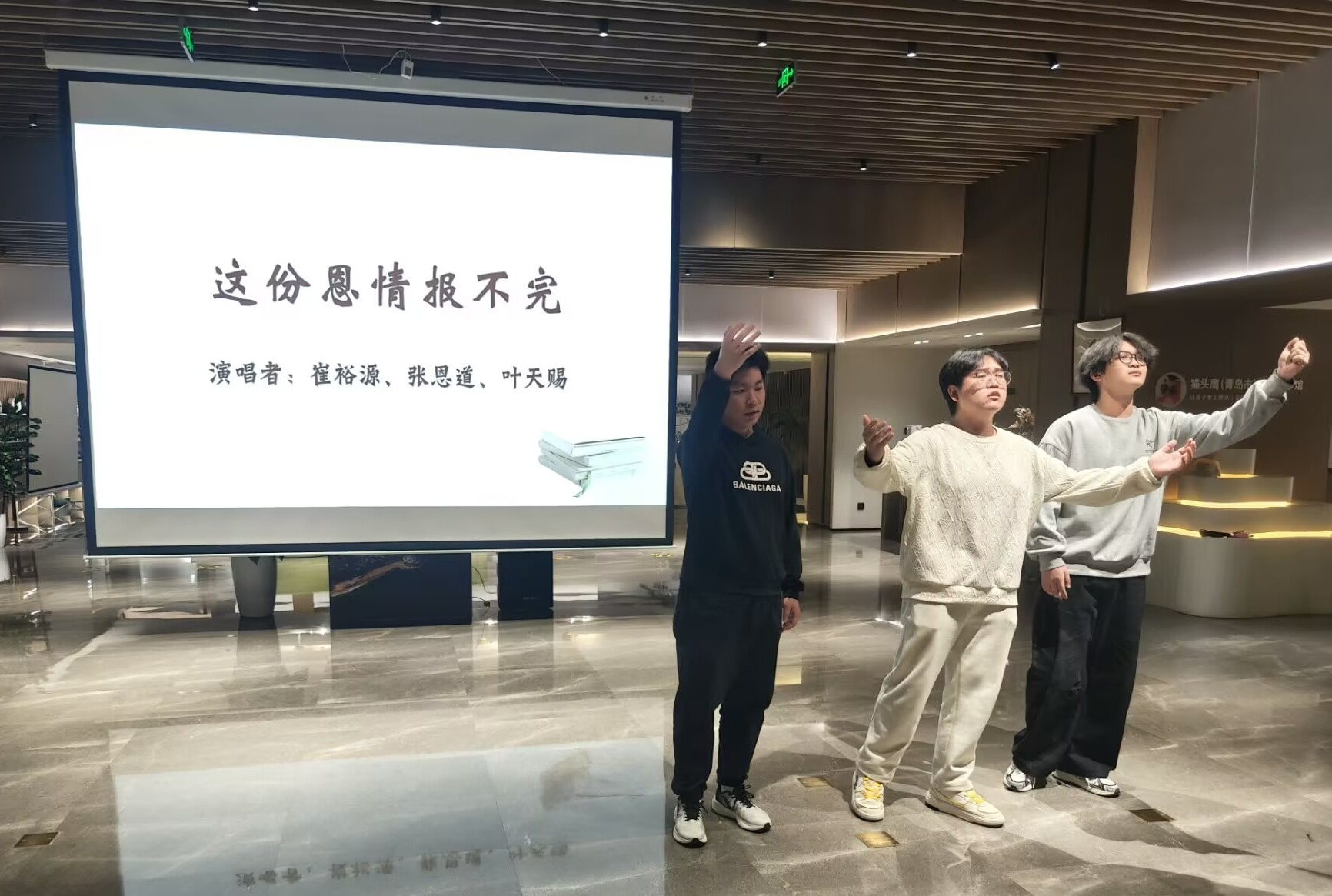 分享环节后,艺术世俱杯买球入口叶天赐、崔裕源、张恩道登台演唱《松花江上》《再看一眼亲人》《这份恩情报不完》,深情的演唱为活动增添了浓厚情感氛围。