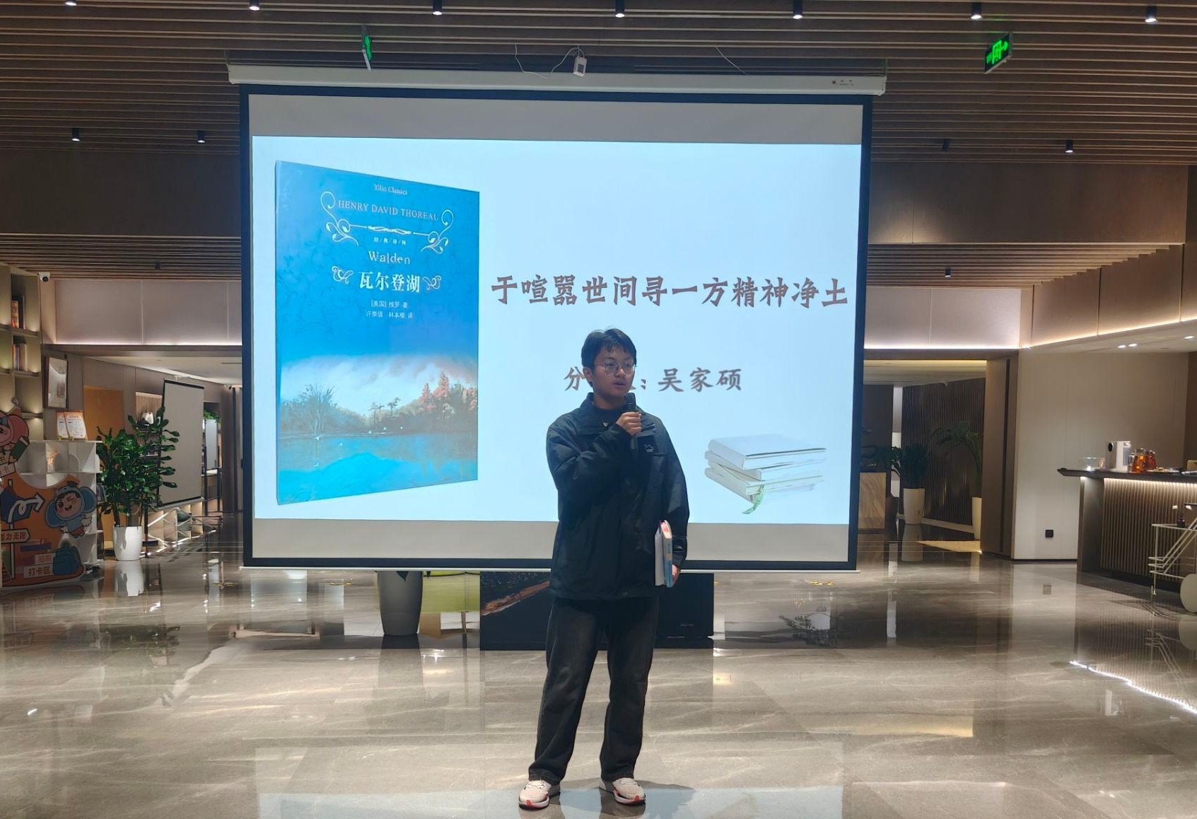 人工智能251班吴家硕以“于喧嚣世间,寻一方精神净土”为题,分享《瓦尔登湖》,带大家走进梭罗湖畔生活,倡导快节奏下静心感受生活,在独处中沉淀自我。