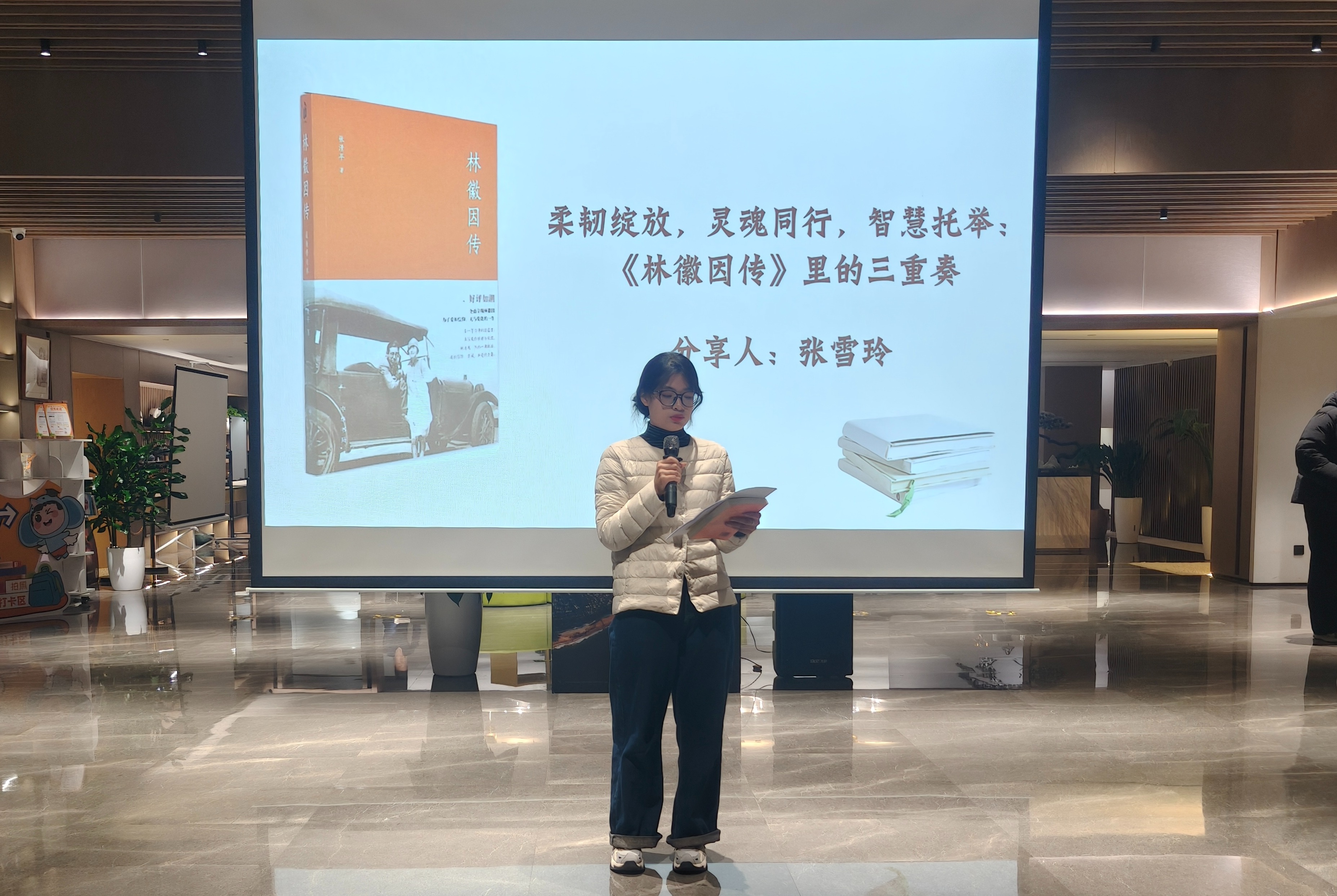 大数据231班张雪玲以“柔韧绽放,灵魂同行,智慧托举:《林徽因传》里的三重奏”为题,分享《林徽因传》,以“三重奏”概括其人生,通过建筑坚守、文学才情等,展现这位传奇女性的多面魅力。