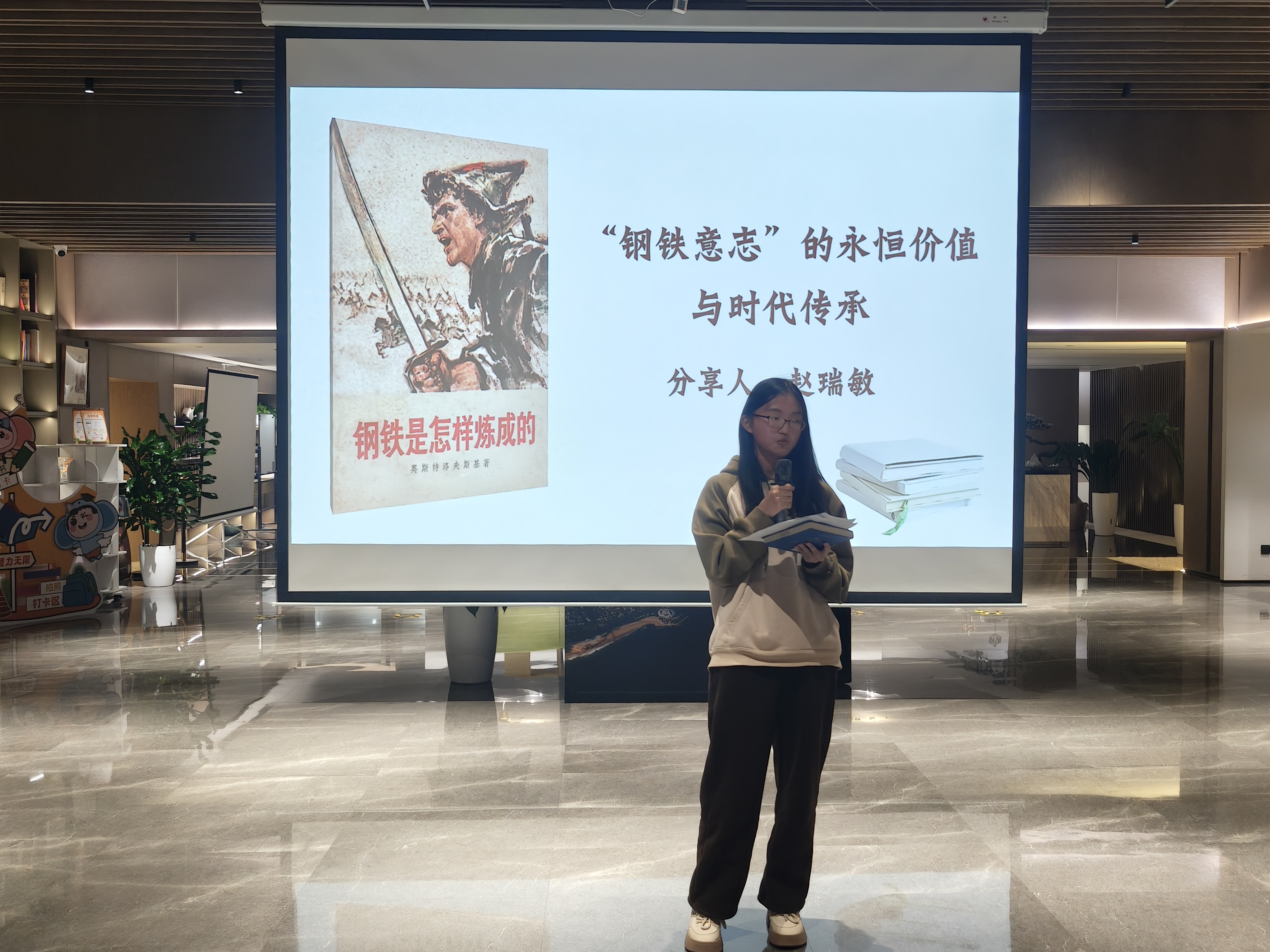 人工智能254班赵瑞敏以““钢铁意志”的永恒价值与时代传承”为题,分享《钢铁是怎样炼成的》,通过阐述保尔钢铁意志,强调其永恒价值,鼓励同学学习迎难而上的精神。