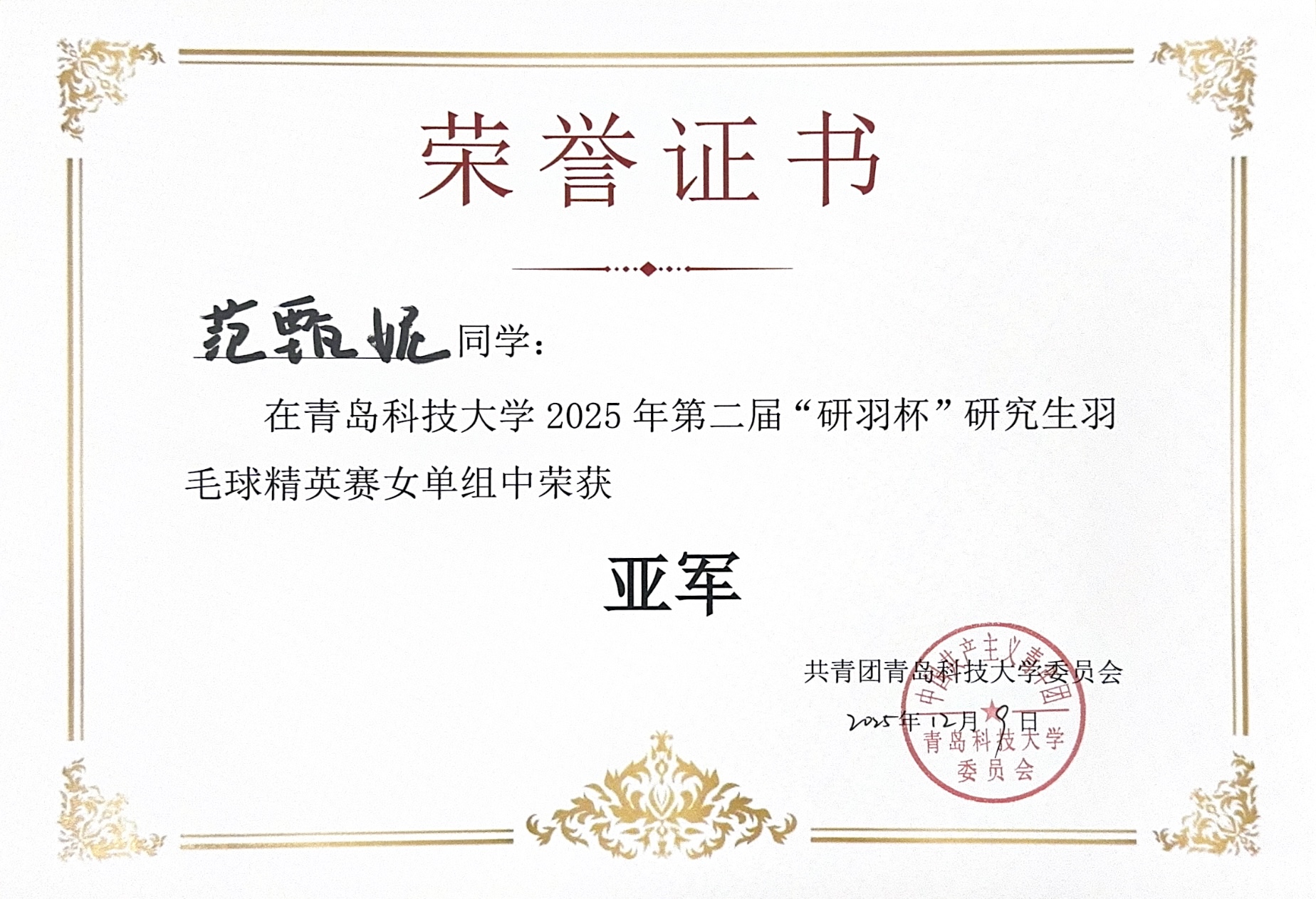 自赛事启动以来,范甄妮同学积极备赛,平衡科研学习与训练,利用课余时间刻苦练习、精进球技、锤炼心态,体现了坚韧不拔、追求卓越的体育精神。比赛过程中,她沉着应战、步伐灵活、技术稳健,以出色的控球能力和战术执行力,一路过关斩将,最终赢得女单亚军佳绩。