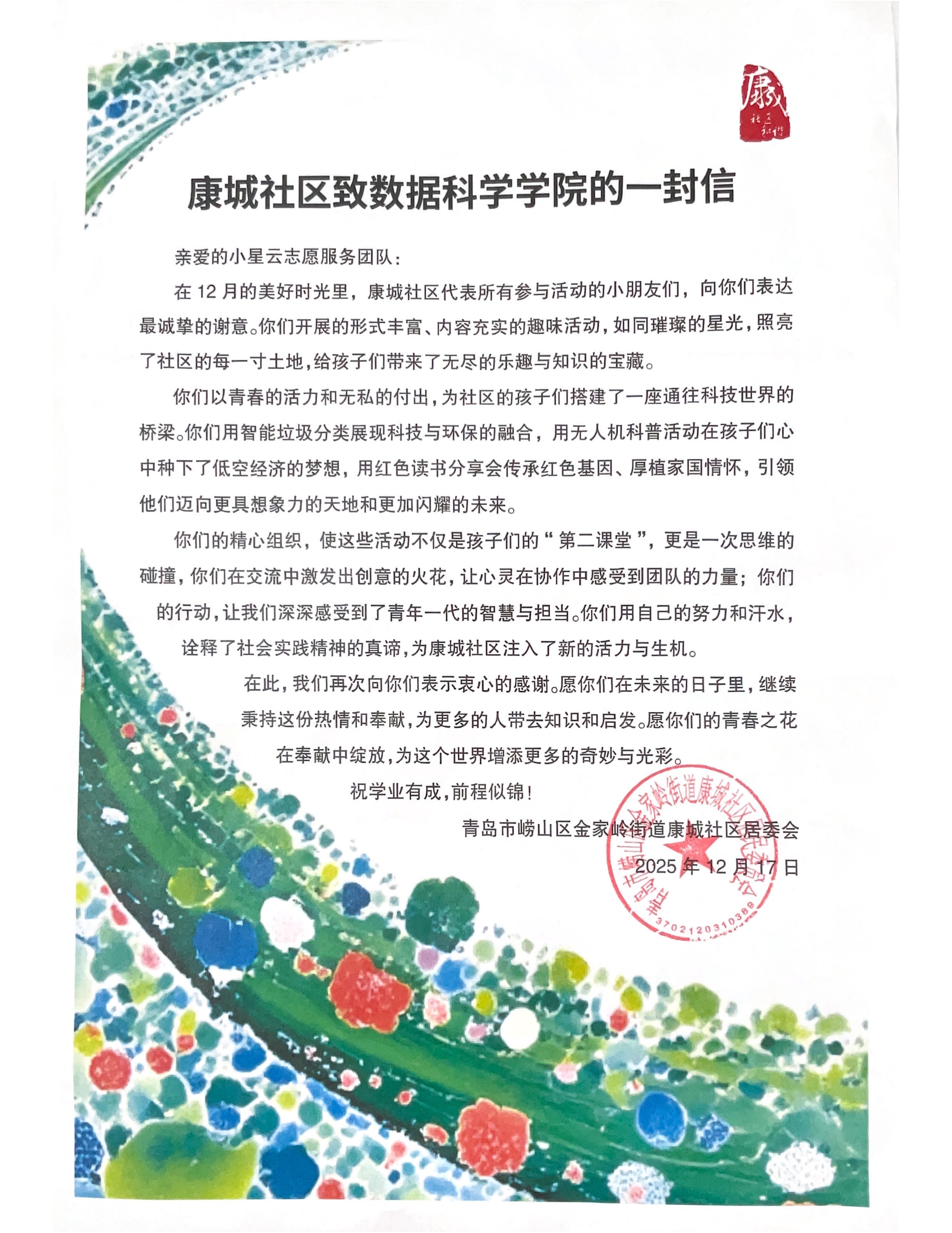 为传承红色基因、厚植青少年家国情怀,响应科技强国战略号召,充分发挥高校服务社会职能,12月,世俱杯买球入口“小星云”志愿服务团队走进青岛市崂山区金家岭街道康城社区,开展系列主题志愿服务活动。“小星云”志愿服务团队以青春担当传递知识温度与成长力量,系列活动获得康城社区居委会、员工家长及青少年群体的高度认可与广泛好评。社区居委会专门致信表达诚挚谢意,充分肯定了志愿服务的专业价值与深远意义。